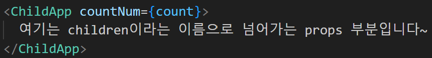 props에 대해서는 https://jyejye311.tistory.com/105에서 설명하였다. props로는 특정 값 뿐만 아니라 HTML을 넘기는 방법도 있다. 이전에 사용한 코드에서 일부만 수정하여 html을 props로 넘겨보았다. 우선, 부모 컴포넌트는 다음과 같다. 더보기 import './App.css'; import { useState } from 'react'; import ChildApp from './ChildApp'; function App() { // count라는 state와 count의 setter를 동시에 정의하는 과정 const [count, setCount] = useState(0); // up 버튼 클릭했을 때 동작하는 함수 const onClickUpCount = (..